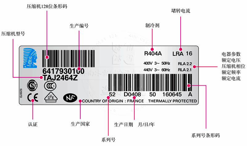 Tecumseh/泰康壓縮機(jī)銘牌說明: